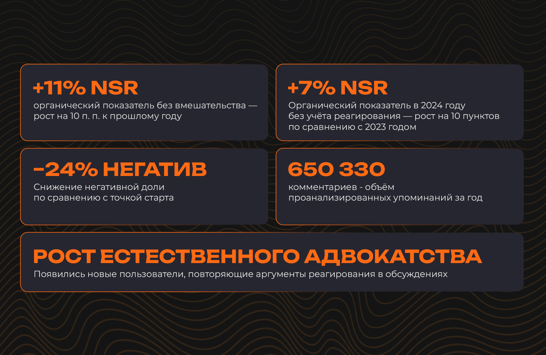 В работе мы опирались на полную аналитику инфополя: отслеживали пользовательские комментарии, упоминания в медиа и стримах, собственные коммуникации бренда и даже нейтральные репосты. Всего за год проанализировали более 650 тысяч комментариев.